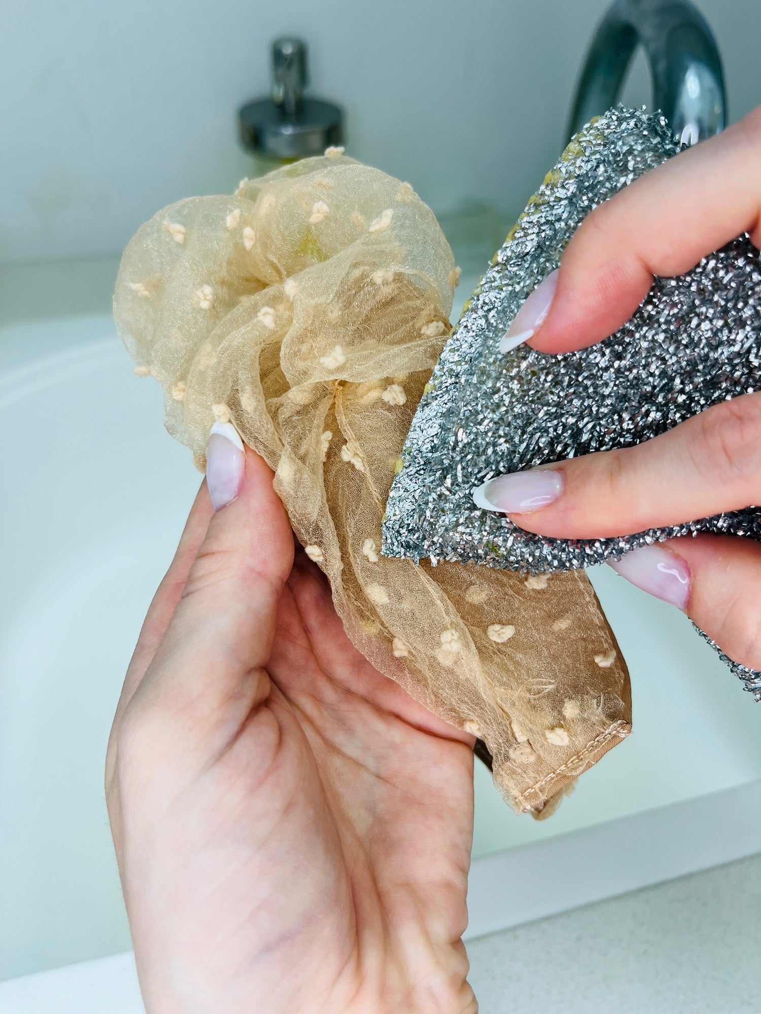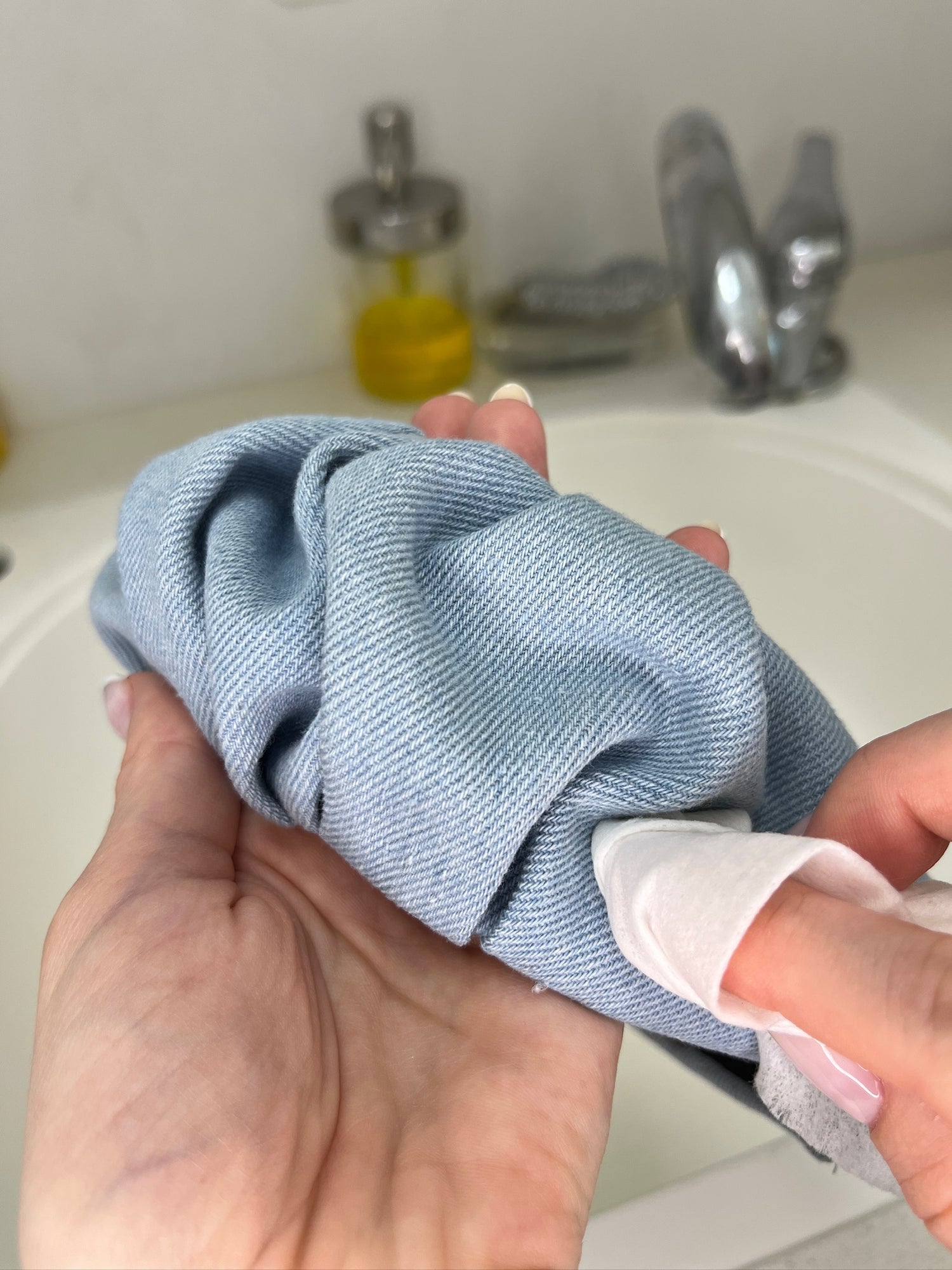 Option 2: Use a clean dish sponge with a bit of water and dish soap to gently wipe the headband. This works best on thicker and less delicate fabrics.